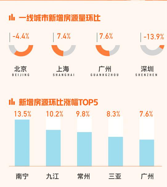 市场供应方面,报告显示全国新增挂牌房源量环比下跌4.8%。一线城市北京和深圳出现一定程度的环比下跌情况,其中深圳新增挂牌房源量环比下降最为明显,为-13.9%;上海和广州新增挂牌房源量环比上涨均超过7%。从全国范围来看,南宁、九江、常州、三亚和广东环比上涨形势备受瞩目,其中南宁以13.5%的环比涨幅排名较高。
