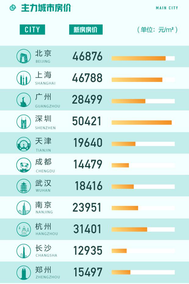 58同城、安居客《8月国民安居指数报告》显示,8月67城新房在线均价为16481元/平方米,环比上涨0.14%,在67城中有33城新房在线均价环比上涨。主力城市中深圳相比上月略微下降,新房在线均价为50421元/平方米。北京、上海新房均价分别以46876元/平方米和46788元/平方米排名第二和第三。广州、南京新房在线均价均在2万元/平方米水平之上,新一线城市中的杭州新房在线均价则达到31401元/平方米,天津跌出2万元/平方米行列,为19640元/平方米。