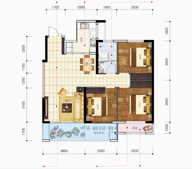 广诚·美林里1号楼建面约107.82㎡三居室,采光无遮挡,推窗见景,户型全明方正,南向三开间双阳台,最宽约10米采光面(客厅面宽约3.8米,主卧室面宽约3.3米,次卧室面宽约2.9米),光与风自在流畅穿行,宽境生活超乎想象。